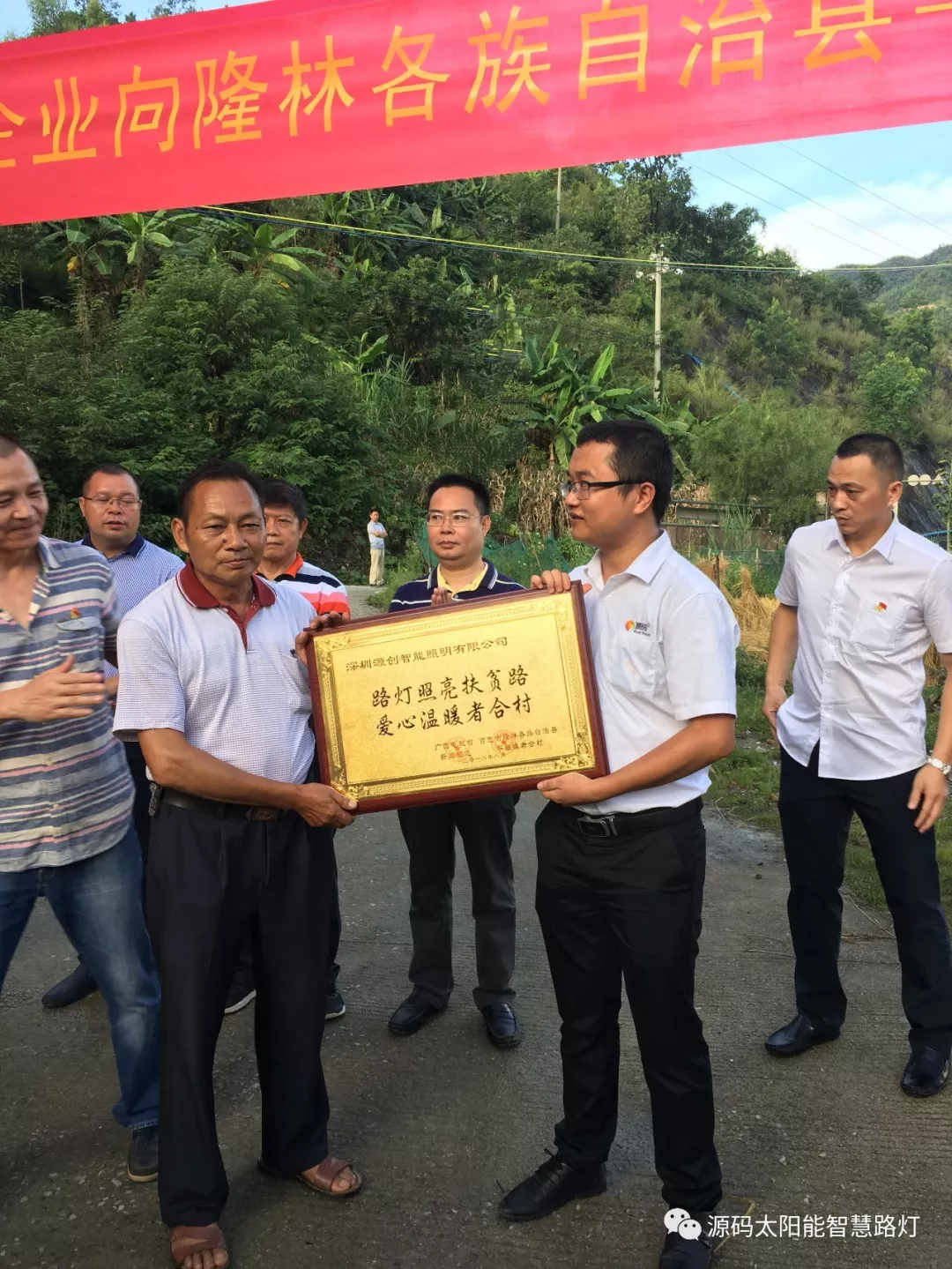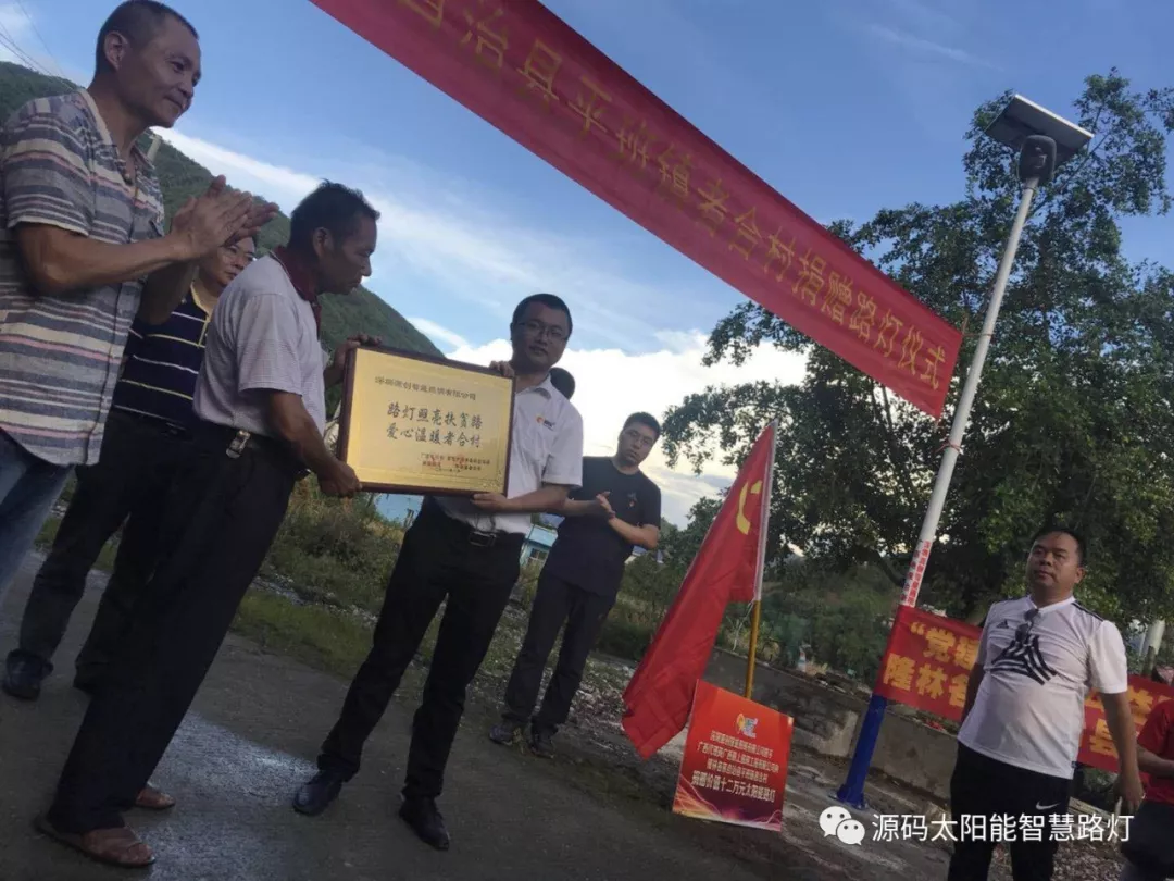 8月31日下午,隆林平班鎮者合村路燈捐贈儀式如期舉行,儀式現場,源碼太陽能路燈劉總及源碼廣西區域經銷商蔡總向者合村無償捐贈太陽能路燈。